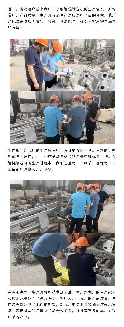 近日青島客戶到我廠查看管鏈輸送機生產(chǎn)進度